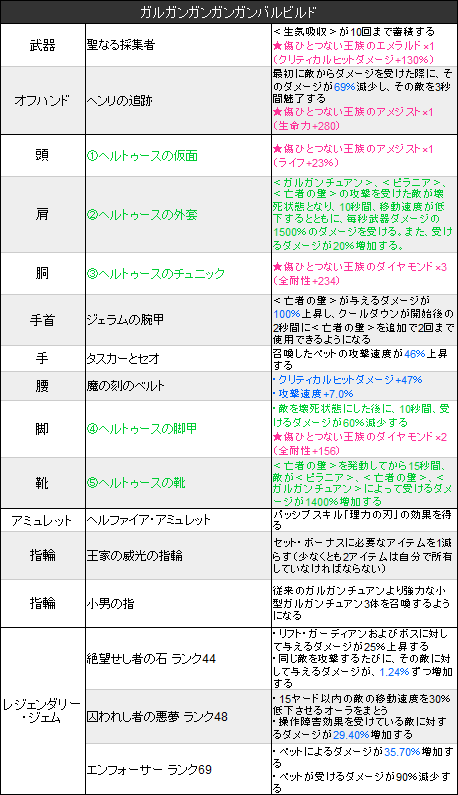 ※ヘルトゥースセットの効果対象スキルはもう少し多いですが、表に入れると長くなりすぎるので対象のスキルのみ記載させてもらっています。効果対象スキルはプラマイリスキル、<酸の雲>、<火炎蝙蝠>、<ゾンビ・チャージャー>、<ゾンビ・ドッグ>、<ガルガンチュアン>、<死者の嫉妬>、<ピラニア>、<亡者の壁>です。